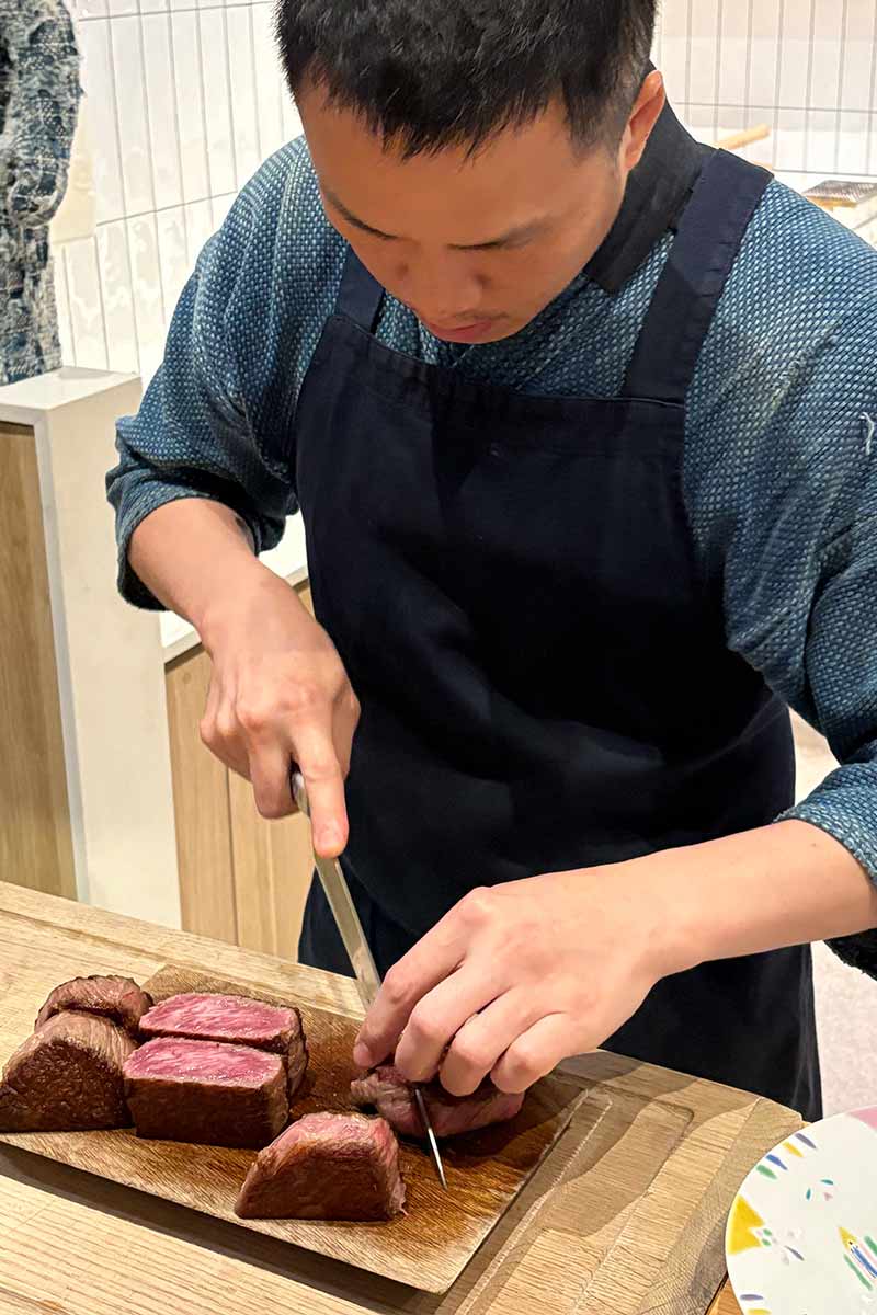 He promises “the best steak of your life,” and he’s not wrong. The wagyu is seared on the hibachi grill, unseasoned, then served in a clear dashi broth he’s spent three hours preparing before we even arrived.