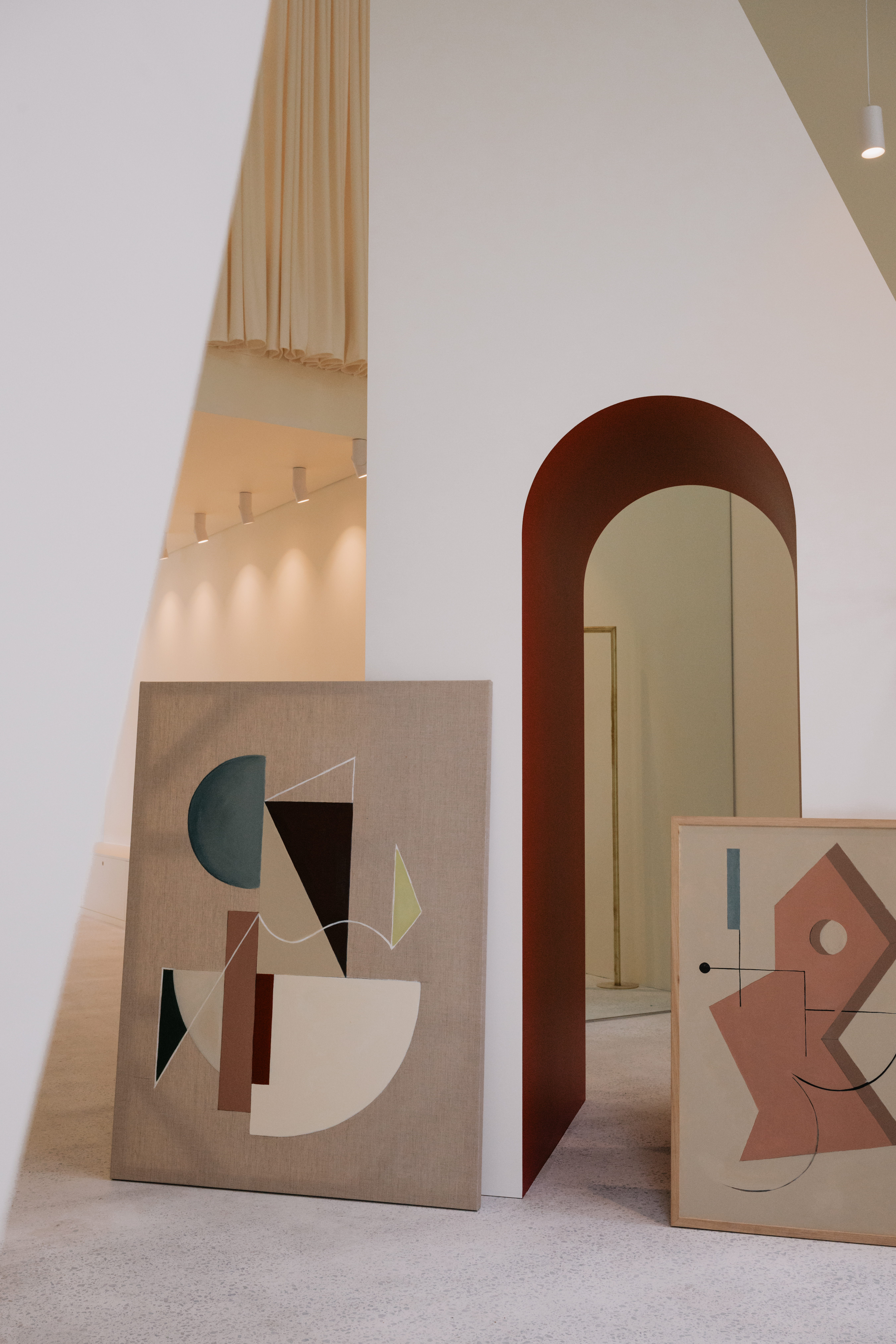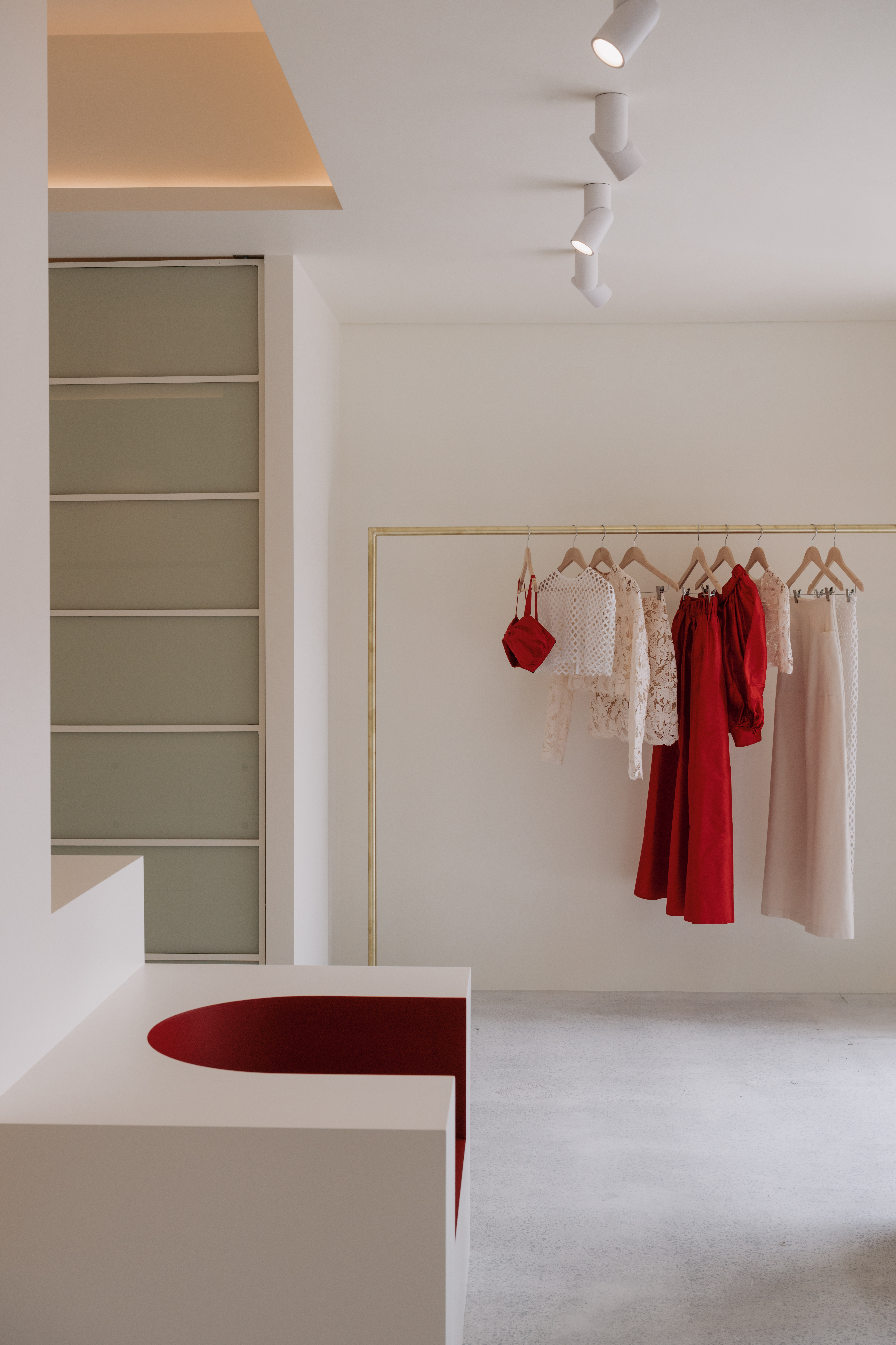 Five-metre abstract sculptures anchor the open space, while a six-metre gallery wall showcases Middleton’s original artworks. Sculptural brass railings arc through the room, blurring the line between installation and garment display. Above, on a sunlit mezzanine, the atelier hums, every garment cut, sewn and hand-finished in real time.