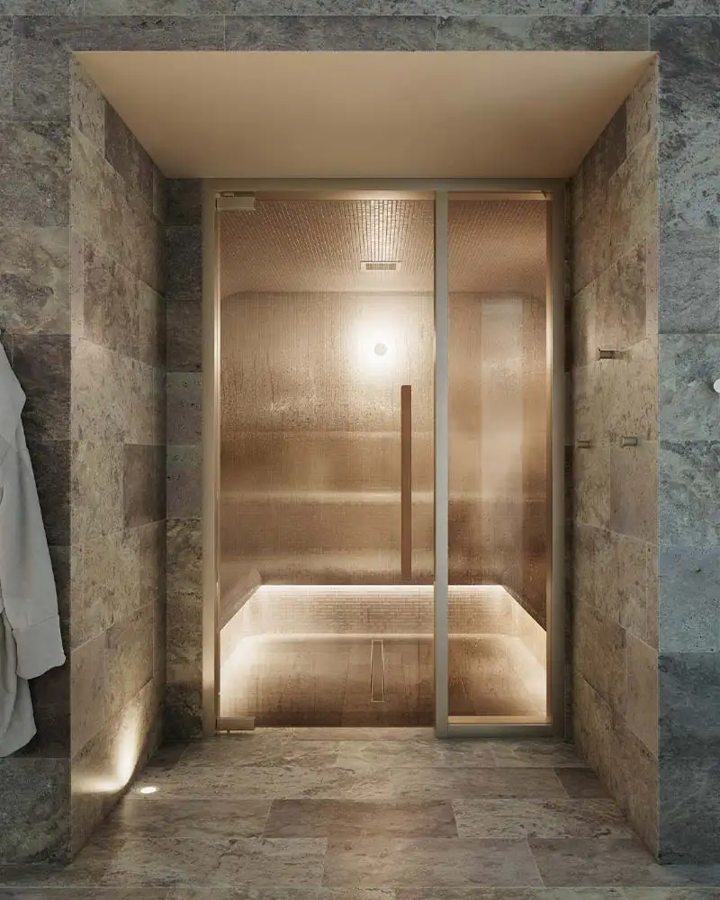 Backdropped by expansive ceilings, moody lighting, and travertine stone, The Bathhouse Albion is designed to mimic traditional European bathhouses.