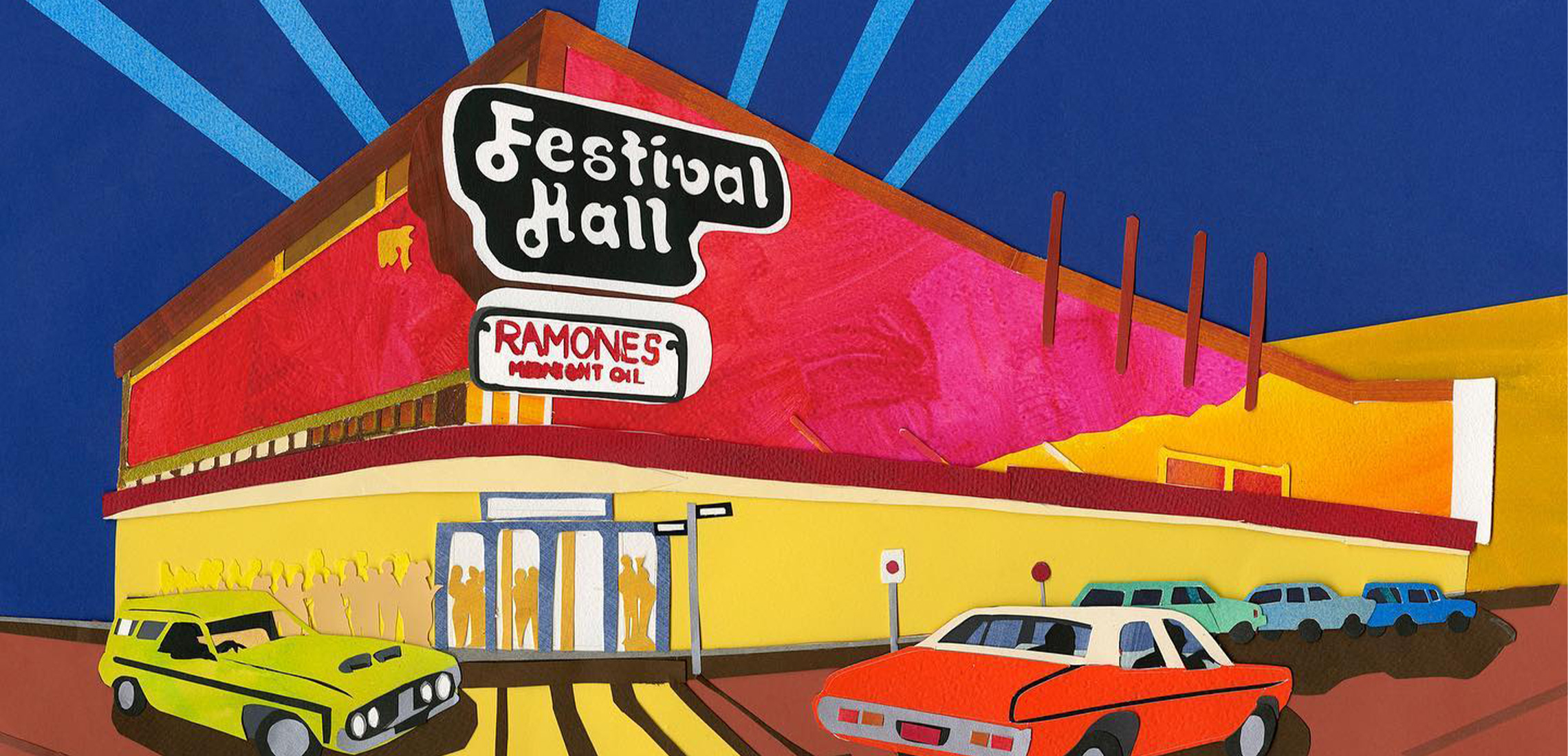 I make works about the places I love in Brisbane, so often I’m capturing how I feel about the place and my connection to it. I use colour, light/shade, and often quirky details. For example, I did a collage of the Old Museum where we went as kids. It’s such a unique building – red brick, ornate, and almost gothic. I contrasted the red brick with a hot indigo sky and blue shadows. It sits in a manicured landscape and used to be surrounded incongruously by prowling dinosaurs and a terrifying World War One tank called Mephisto, which I included in my artwork.