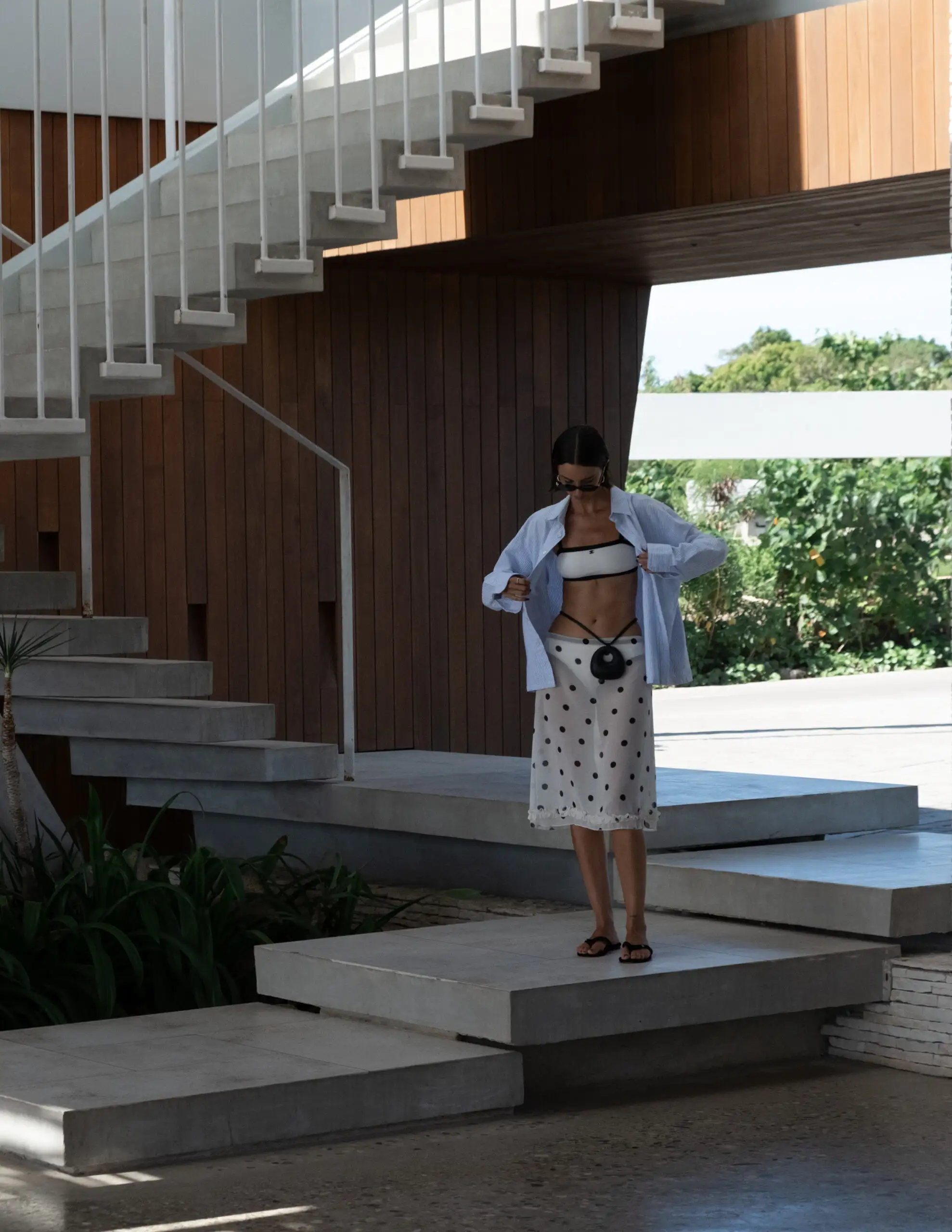 Every outfit started with whatever bikini I had on that day. I gravitated toward sheer dresses and skirts, often thrown over with one of Blake’s oversized shirts and my favourite Miu Miu sunnies. One of the looks I loved was a bold Arcina Ori dress — just the right amount of drama!